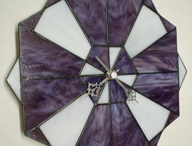 Vitrážové dekorativní hodiny o průměru cca 28 cm, bílé opálové sklo Spectrum a fialové Uroboros, černá patina, stříbrná malá a velká ručička, hodinový strojek německé výroby na tužkovou baterii.