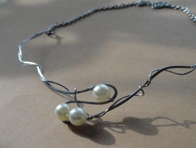 Náhrdelník z nerezového drátu a perel (korálků perleťové barvy).. Na fotkách s řetízkem z chirurgické oceli, ale možno zavěsit na nerez obruč či šifonovou stužku.. Délku bych doporučovala těsně okolo krku, upravím na přání..