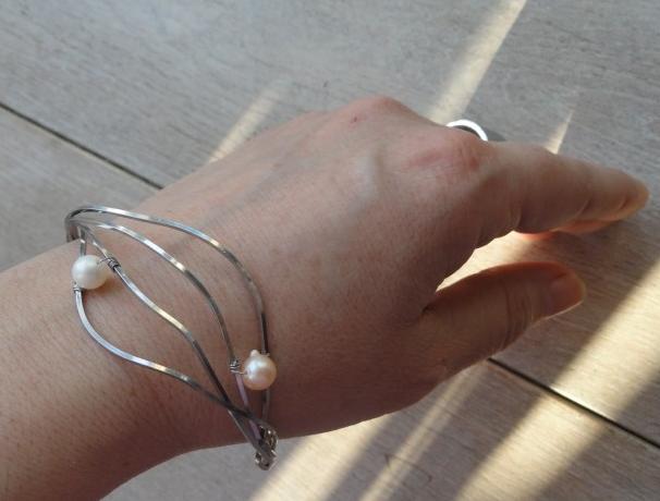 Náramek z profilovaného nerezového drátu ozdobený říční perlami bílé a broskvové barvy.