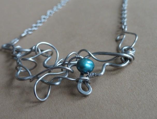 Přívěsek z nerezového drátu ozdobený říční perlou tyrkysové barvy. Možno zavěsit na řetízek s chirurgické oceli či kůži.