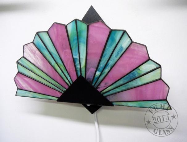 Nástěnná lampa s originálním stínidlem ve tvaru vějíře vyrobeným tiffany technikou o rozměrech 17,5 x 36 cm, kovové tělo v černé barvě, celkové rozměry lampy 26 x 36 cm, černá patina, ošetřeno antioxidantem.
