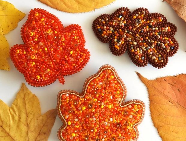 Výrazná podzimní brož, vyrobená moderní technikou korálkové výšivky z českého rokajlu Preciosa různých barev, tvaru a velikosti.