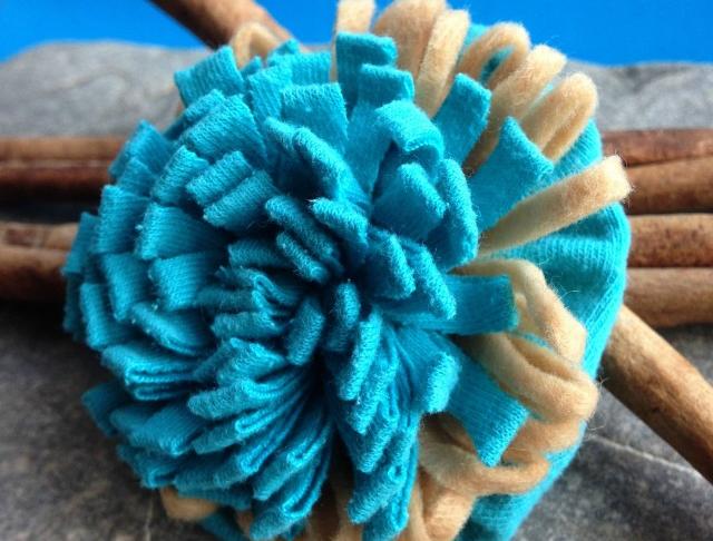 Tyrkysová střapatá brož z bavlny a béžového filcu. Brožové zapínání.