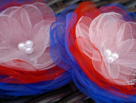 Brož - spona ve tvaru květu, vyrobená z "květinových plátků" organzy barvy trikolory - modrá, červená a bílá, zdobená perličkami, rozměry: průměr cca 7-8 cm, výška cca 2,5 cm.
