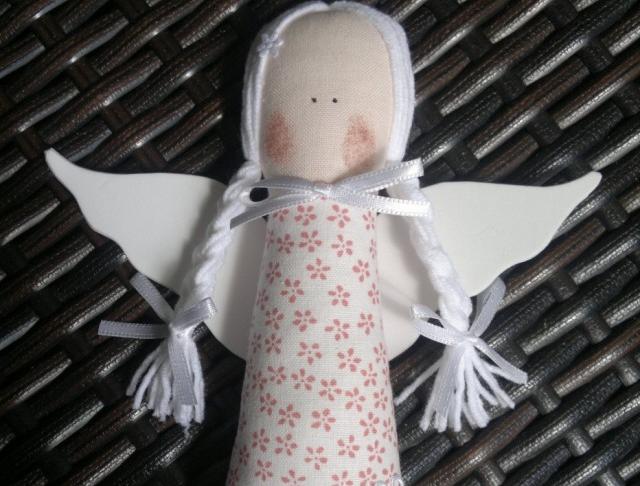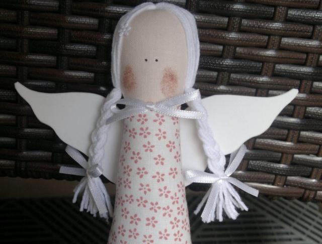 Andělka ušitá ze světle režné bavlněné látky se starorůžově růžovými kvítky, plněná dutým vláknem, zdobená krajkou, saténovými kytičkami a stužkou, vlásky z vlněné příze, očka malovaná barvou na textil, křidélka z bílého pěnového papíru moosgummi.