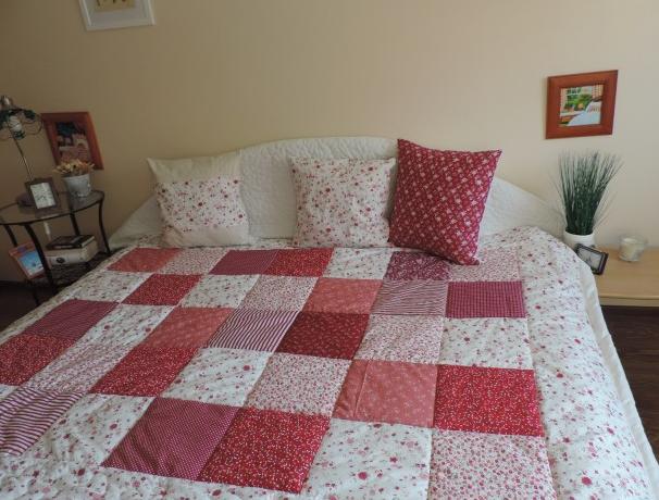 - přehoz je prošitý do čtverců...okrje jsou navíc ozdobně proquiltovné aby přehoz byl pěkný i po vyprání..