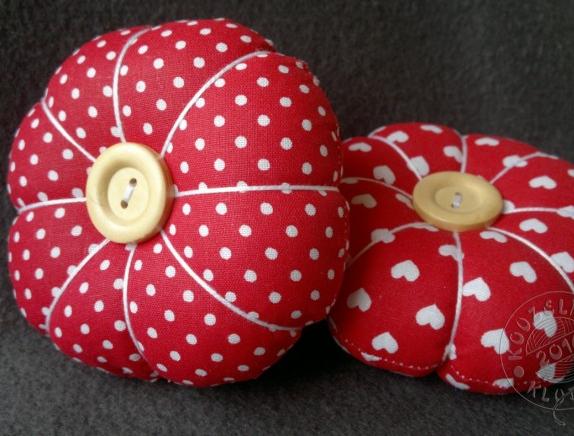 Jehelníčky ve tvaru kytičky, ušité ze 100% bavlněné látky různých barev, VZOR PUNTÍKY, plněné dutým vláknem, zdobené 1 dřevěným knoflíkem (průměr cca 2cm). Rozměr jehelníčku - průměr cca 9,5 cm.
