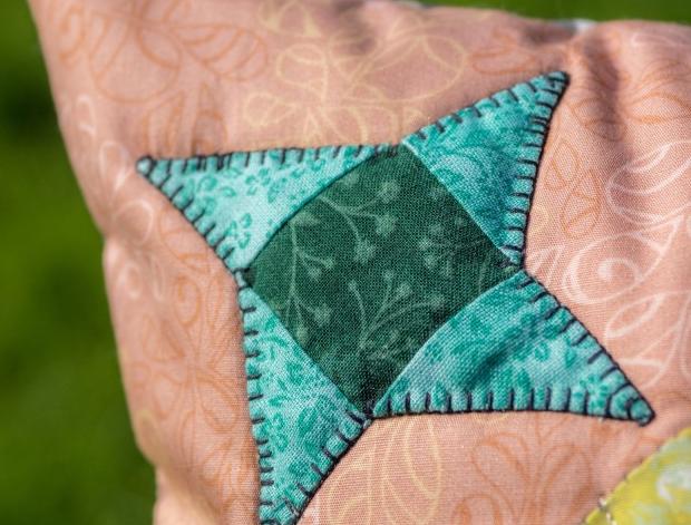 Patchworkový povlak na polštářek je velký 40 x 40 cm. Je ušitý z bavlněných látek, zdobený aplikací hvězd a bohatým prošíváním květin. Přední strana je třívrstvá, uvnitř vypodložená vatelínem. Vzadu je zapínání na zip.