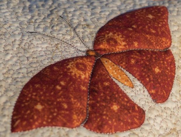 Povlak na polštář je ušitý z bavlněných látek, je velký 40 x 40 cm. Přední strana je třívrstvá, uvnitř vyplněná vatelínem a ozdobně prošitá na stroji, motýl a květina plasticky vystupují. Vzadu je zapínání na zip.