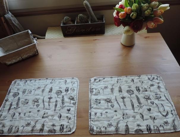 prostírky jsou oboustranné,opačná strana je smetanovo-béžové kárečko,prostírky jsou vyztužené a prošité aby pěkně držely tvar i po vyprání...