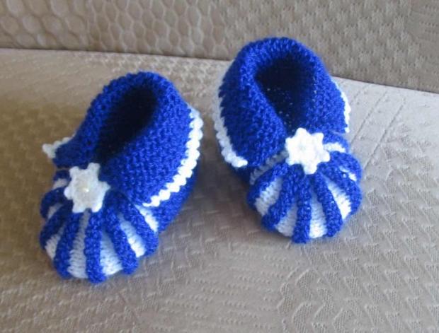 Ručně pletené bačkůrky pro mrňousky v kombinaci tmavě-modré a bílé barvy