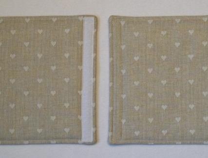 Chránič lze použít oboustranně. Z obou stran je použita vzorovaná béžová 100% bavlna. Chrániče jsou vypodloženy vatelínem, takže jsou příjemně měkké a hezky drží tvar. Zapínání je na suchý zip.