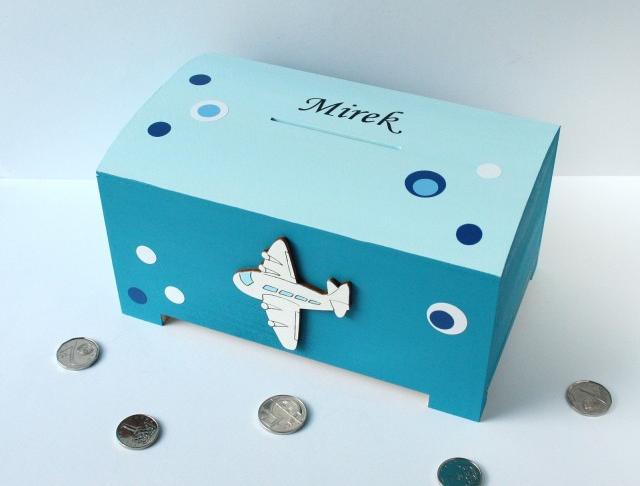 Dřevěná pokladnička pečlivě opracovaná, ručně malovaná akrylovými barvami a dozdobená dřevěným výřezem letadla a doplňky.