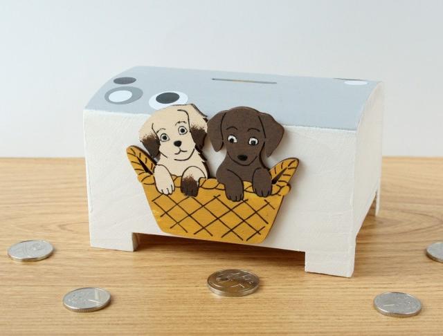 Dřevěná ručně malovaná pokladnička ozdobená dřevěným výřezem pejsků v košíku.