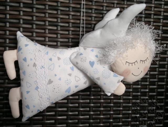 Anděl ušitý z bavlněné látky - bílý podklad se světle modrými a šedými srdíčky., křidélka z bílé látky, plněná dutým vláknem, vlásky z příze, zdobené krajkou, obličej malovaný barvou na textil, opatřená poutkem. Vše jen strojně a ručně šité, bez lepení.
