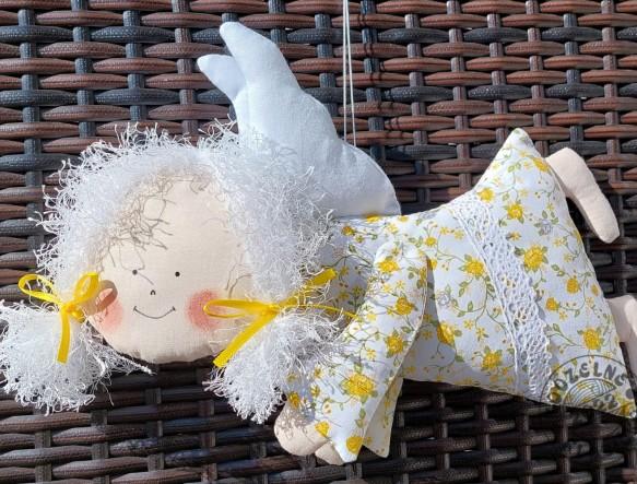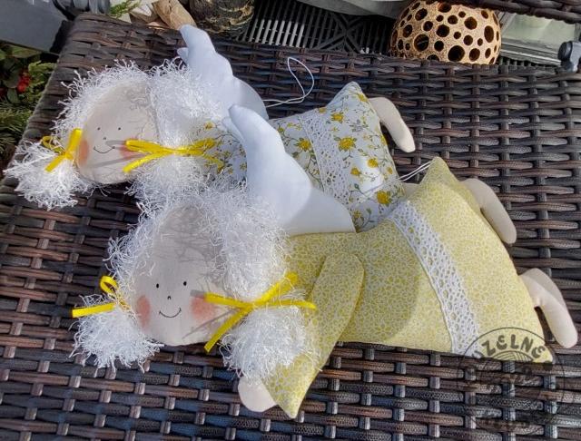 Andělka z jarní kolekce ušitá z bavlněné látky, křidélka z bílé látky, plněná dutým vláknem, vlásky z příze, zdobené krajkou, stužkou, obličej malovaný barvou na textil, opatřená poutkem. Vše jen strojně a ručně šité, bez lepení.