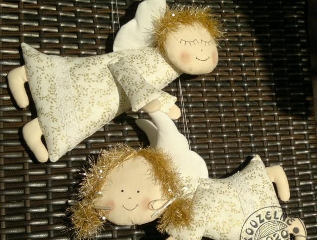 Andělka ušitá z bavlněné látky - bílý podklad se zlatým vzorem - drobné lístečky, křidélka z bílé látky, plněná dutým vláknem, zlaté vlásky z příze, zdobená krajkou, stužkou, obličej malovaný barvou na textil, opatřená poutkem. Vše je strojně a ručně šité, bez lepení. Vlásky jsou z příze s lesklou zlatou nitkou, která se na sluníčku krásně leskne.