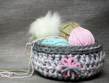 Háčkovaný košíček bucláček ze silné akrylové příze a bavlněné příze, předeno trojnit, krásně držící svůj tvar.