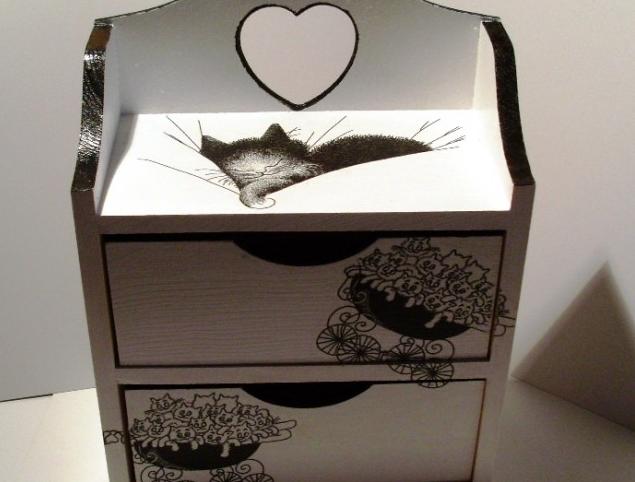 Dřevěná komoda se dvěmi šuplíky je zdobená decoupage s KOČIČÍM motivem . Slouží k úschově všech životně důležitých věcí, které máte rádi :-) Vnitřní, zadní a spodní strana je ponechána bez úpravy.