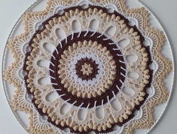 Háčkovaná mandala v odstínech hnědé a přírodní barvy v kombinaci s bílou. Je háčkována z kvalitní 100% bavlny od českého výrobce.