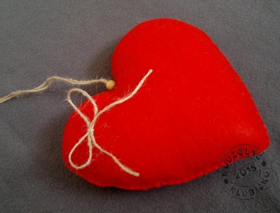 Ručně šité srdíčko z červeného filcu/plsti, plněné dutým vláknem, ozdobené mašličkou z provázku, doplněné poutkem k zavěšení a dřevěným korálkem.
