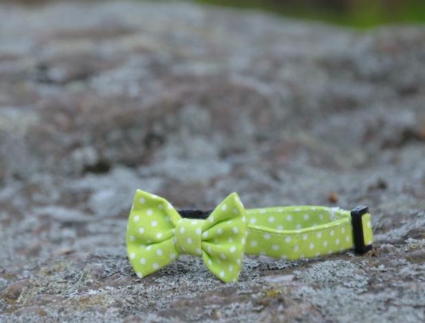 Motýlek pod krk - pro šviháka pejska nebo psí fešáckou dámu., na dny všední i sváteční. Ušitý ze světle zelené bavlněné látky s malými puntíčky, pásek je stejný, má zapínání a možnost volby obvodu 21 - 28 cm. Motýlek je velký (tedy spíš malý:-) ) 5 x 3 cm, na pásku se volně posunuje, takže ho umístíte tak, jak se vám líbí...