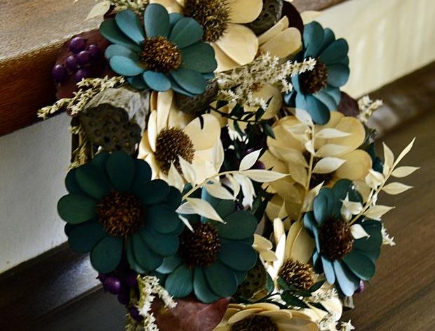 Originální přírodní věneček na proutěném základu s dřevěnými květinami, staticí, sušeným ruskusem a ost.sušinou. Průměr 25 cm, tloušťka 10 cm.
