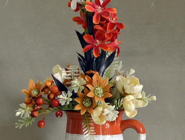 Květinová nejen podzimní dekorace v keramickém krásném hrnku s umělými květinami, kapradím a bobulemi. Vel. na výšku je 34 cm, na délku 20 cm.
