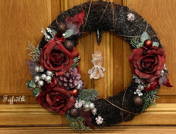 Vánoční věnec s krásnými zasněženými látkovými růžemi, sametovými listy v bordočervené barvě, jehličím, bobulemi, skleněnými baňkami a sněhuláčkem (skloplast).