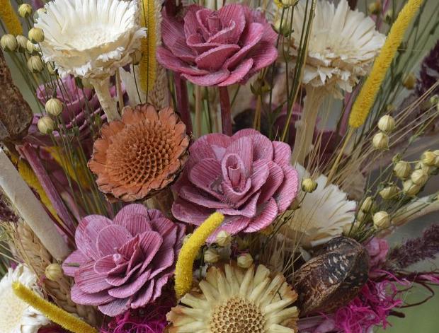 Přírodní sušinová dekorace ze spousty druhů sušiny naší i exotické s dřevěnými růžemi a srdíčky v růžovém košíku.
