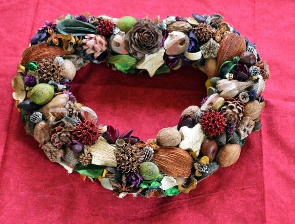Srdce velké i s přízdobou 37 cm na 27 cm z přírodních materiálů, sušiny, oříšků, kaštanů, různýchdruhů portpouuri, šišek a dřevěných hvězdiček. Vánoční dekorace