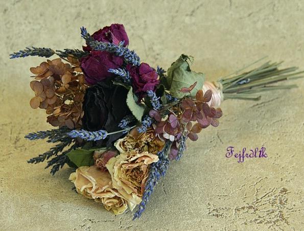 Vázaná kytička ze sušených letošních růžiček a levandule + loňské hortenzie. Vel.27 cm /průměr 16 cm.