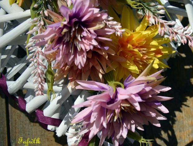 Podzimní trvanlivá dekorace-proutěné srdce s umělými astrami, vřesem a bobulkami. Doplněno stužkami. Vel.32/46 cm.