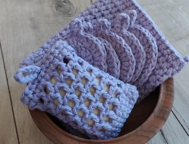 Sada v levandulové barvě se skládá z mycí žíňky, síťky na mýdlo a odličovacích (masážních) tampónků. Každý kousek má poutko pro zavěšení.