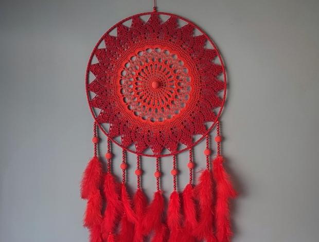 Základní kovový kruh má průměr 40 cm. Je omotán 100% bavlnou a vyplněn ručně háčkovanou krajkou z velmi kvalitní příze 50% bavlna a 50% polyakryl od českého výrobce. Tato příze je postupně stínovaná s dlouhými barevnými přechody a barva postupuje od středu od světle červené až po tmavší červenou na okraji. Na kruhu je na dřevěných korálcích a voskových perlách zavěšeno červené pštrosí peří.
