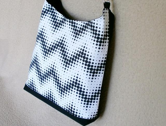 Kabelka je zhotovena z vysokogramážové černobílé dovozové bavlny a z černé směsové tkaniny. Po celé ploše je podžehlená ronopastem (drží tvar), dno je zpevněné a bude vypodšívkovaná. Zapínání je na zip. Má nastavitelný popruh pro variabilní nošení klasicky na rameno a nebo křížem přes prsa. Uvnitř jsou 2 kapsy, jedna větší na zip a menší dělená.