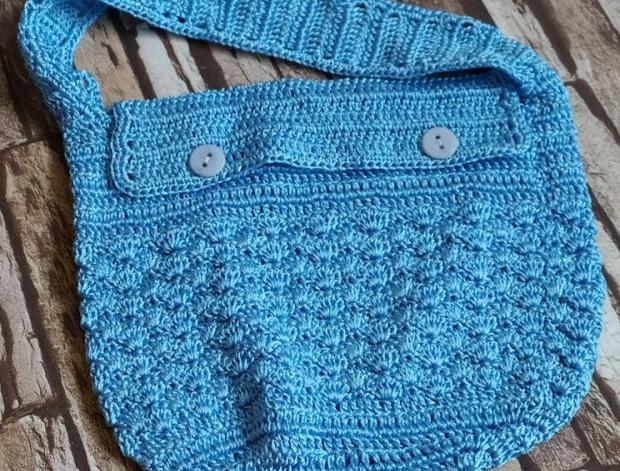 Kabelka je z lesklé světle modré příze a není podšitá. Zapíná se na dva knoflíky.
