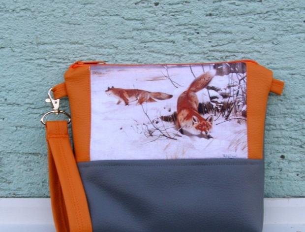 Taštička/kabelka s krásným obrázkem "kmotry lišky". Doplnila jsem ji oranžovou a šedouou koženkou.