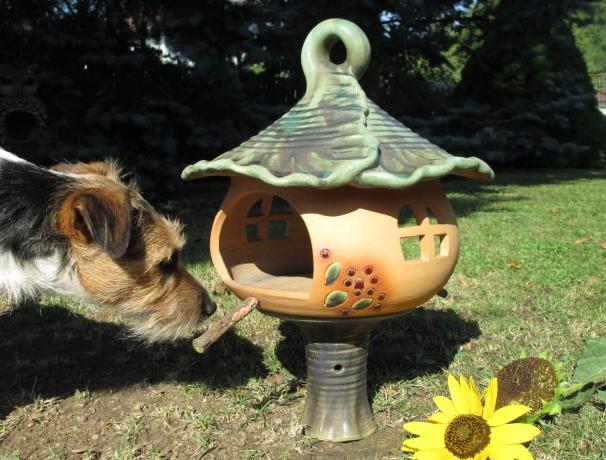 Krmítko pro ptáčky je vytočné a domodelované z hlíny, vysoce vypálené, je mrazuvzdorné.