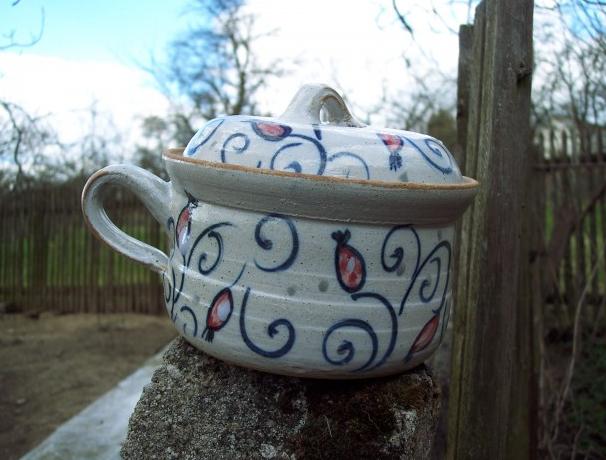 Je to kameninová nádobka - hrneček s víčkem . Je celý malovaný
