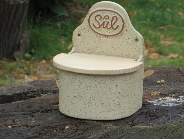 Nádobka s dřevěným víčkem. Může se upevnit na zeď, nebo jen tak postavit.
