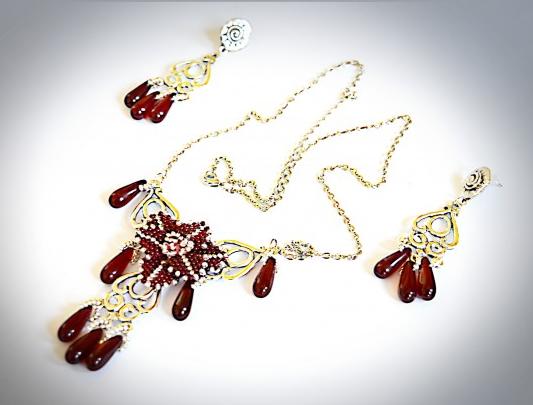 Náhrdelník je tvořen ze tří ozdobných ověsů které jsou ozdobeny mačkanými korálky v růdé barvě zavěšenými pomocí střibrného rokajlu, střed vyplńuje květ tvořen 6ti lístky zhotoven z růdurého a stříbrného rokajlu vel. 11/0. Úplný střed pak vyplňují tři rokajlové korálky velikosti 6/0 v růžové barvě a ohraničeny opět stříbrným rokajlem vel. 11/0. Přívěšek působí velice elegantně a je zavěšen na postříbřeném řetízku.