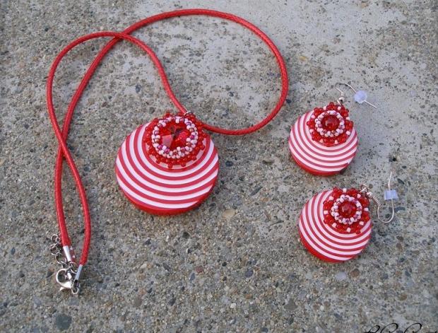 přívěsek i náušnice tvoří plastický přívěsek z plastu, který je zdobený rokajlem a skleněnými korálky nebo rivolkou