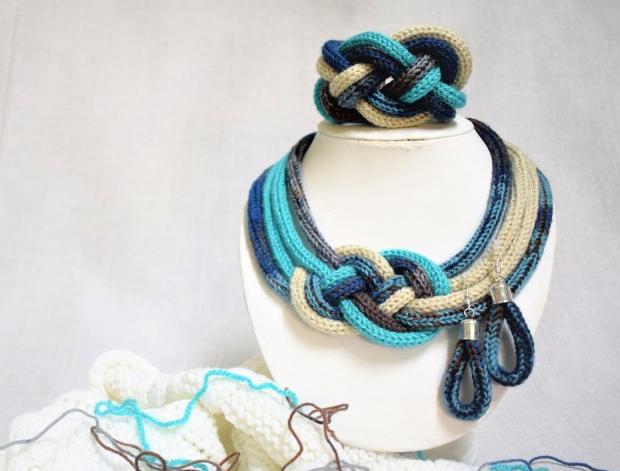 Špagetový set 3 kusů vyrobený z akrylových přízí , ručně umotán do špagátů, náhrdelník, náušnice a náramek, použity bižuterní komponenty.