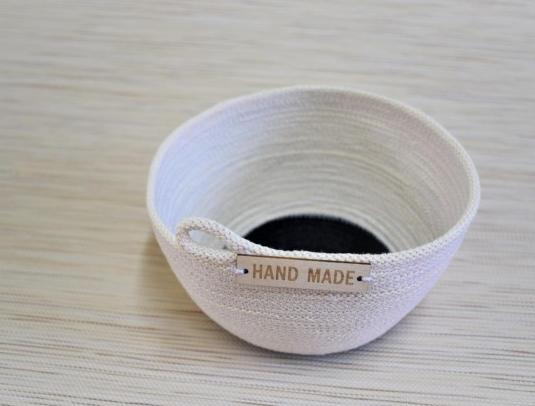 Bavlněný košík z kolekce Cecílie , bonbónovka o výšce 8 cm a průměru 14,5 cm je dekorován dřevěným štítkem