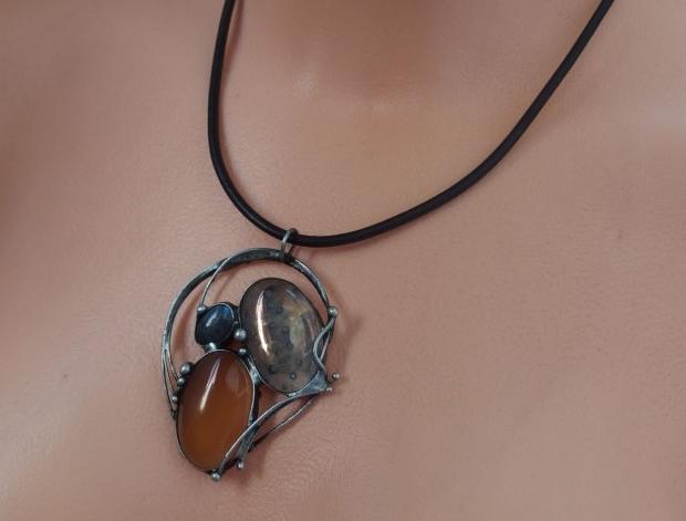Cínovaný přívěsek s oranžovým achátem, labradoritem a fusingovým sklíčkem.
