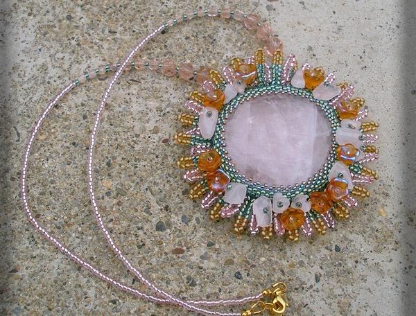 kámen je zavěšený na řetízku z jemně růžového rokajlu a broušených korálků, také v růžové barvě