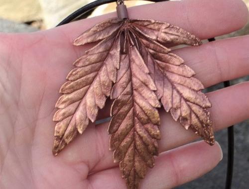 Pokovený list konopí zavěšený na kožené šňůře, zapínání na karabinku (možnost vyměnit za měděný řetízek)