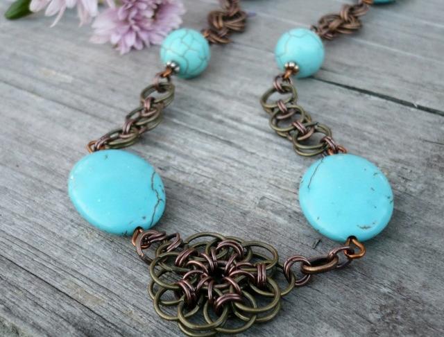 Delší náhrdelník s kroužkovanou květinkou, tyrkenitovými plackami a kuličkami. Kroužky v barvě staromosazi a staromědi, běžný kov. Délka 69 cm, velikost květinky 2,5 cm. Zapínání OT staromosaz