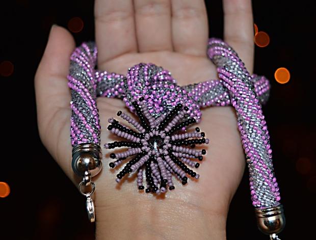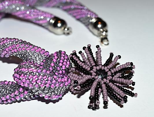 Náhrdelník je tvořen časově náročnou technikou háčkování s přidáním rokajlu velikosti 10/0 v čirých barvách s růžovým a černým průtahem. V prostřední části je zdoben uzlem ke kterému je přišita obšitá SWAROVSKI rivolka crystal Silver Night F ke které byl přidán lesklý rokajl černé a fialkové barvy. Kytička je šita vlascem o síle 0,25. Celkem bylo použito na celý háhrdelník 3610 korálků.